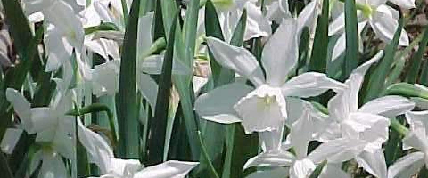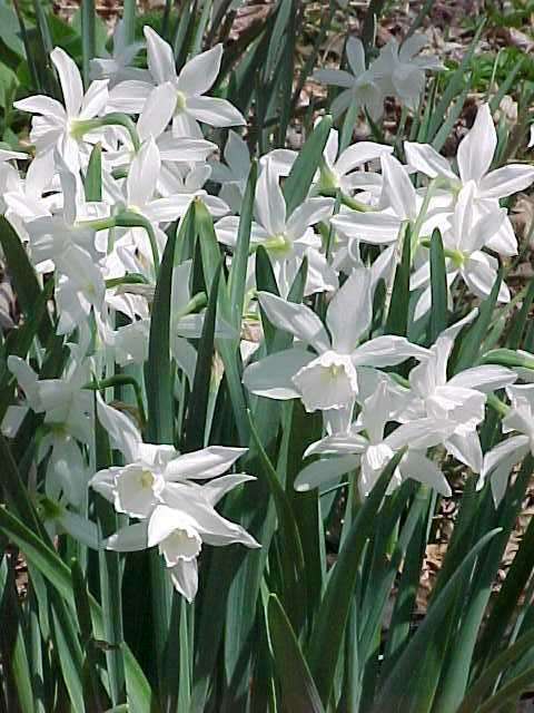 Stems reach 12"-14" in height; flowers are white, outward-facing with a short trumpet, fragrant.